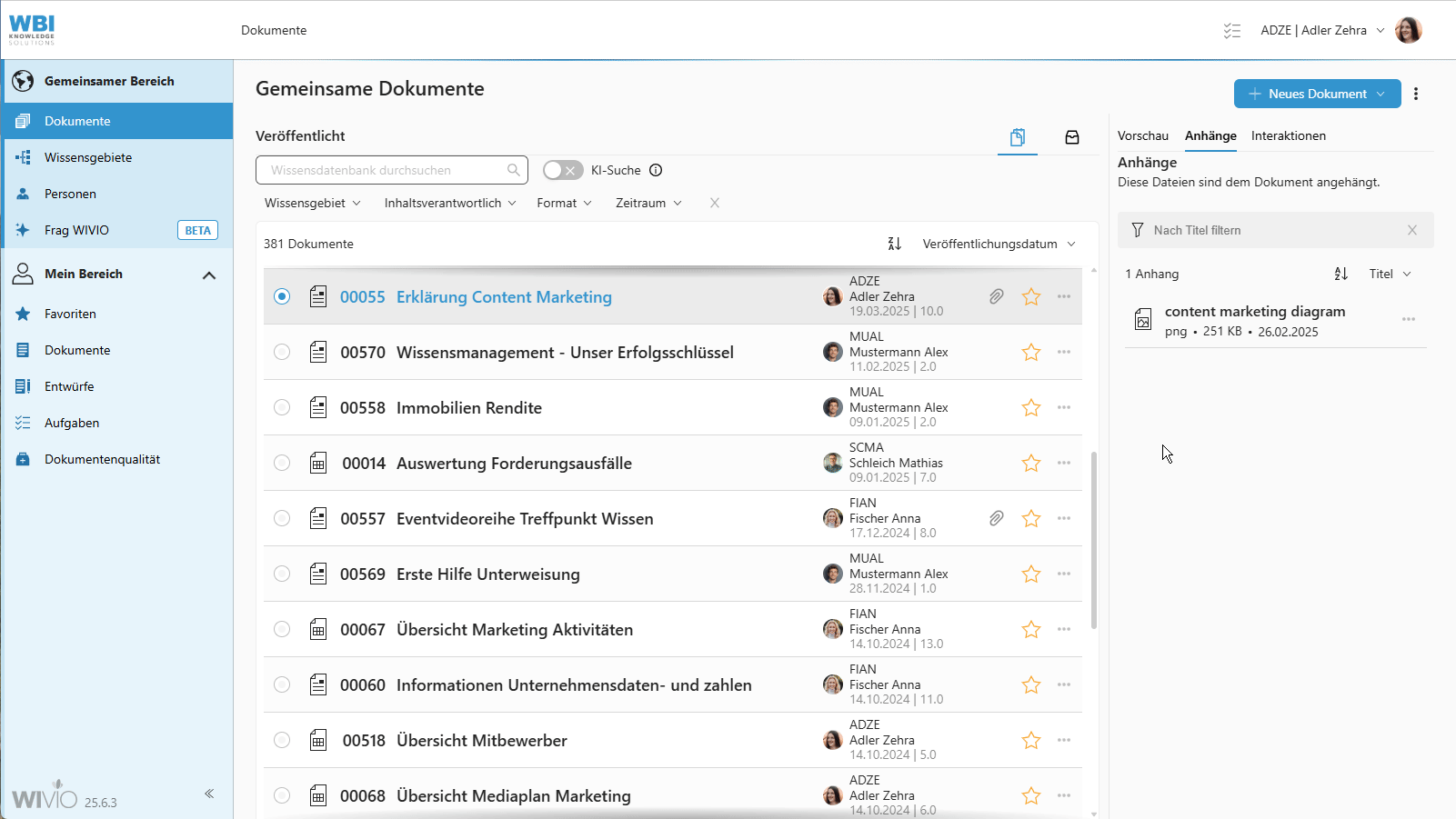 Anhänge sind auf Detailseiten sowie in Listen klar erkennbar und lassen sich über eindeutige Links schnell teilen. Firmenrelevantes Wissen wird dadurch transparent und übersichtlich zugänglich. Es entsteht ein Single-Point-of-Truth für alle Informationen und das zeitaufwändige Suchen hat endlich ein Ende.