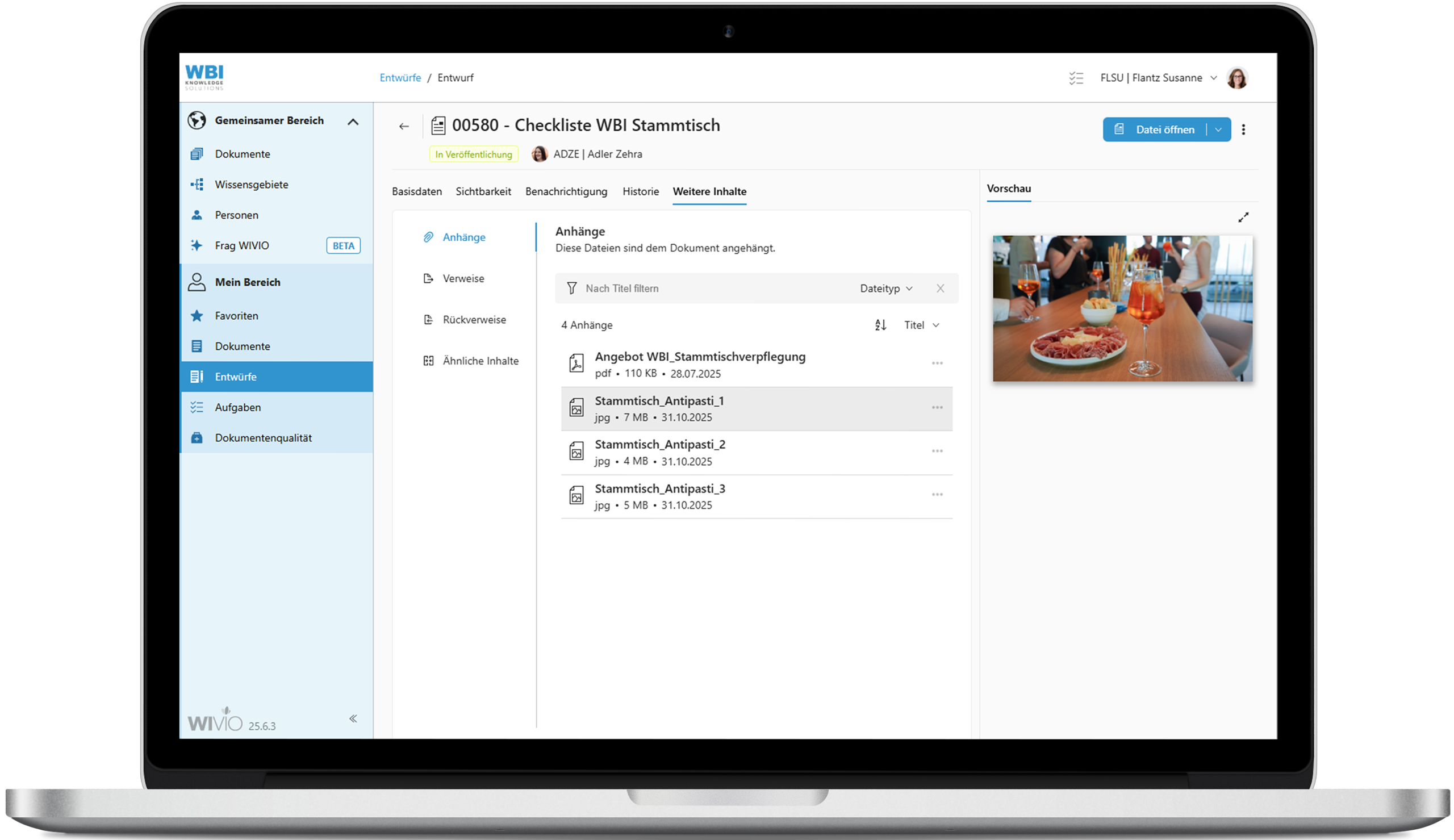 Mit den Datei-Anhängen in WIVIO lassen sich alle unternehmensrelevanten Inhalte zentral bündeln – von Word- und PDF-Dateien bis hin zu Bildern, Videos und Prozessgrafiken. Dank der einfachen Verwaltung direkt im Browser können Dateien per Drag & Drop hochgeladen und durch eindeutige Links geteilt werden.