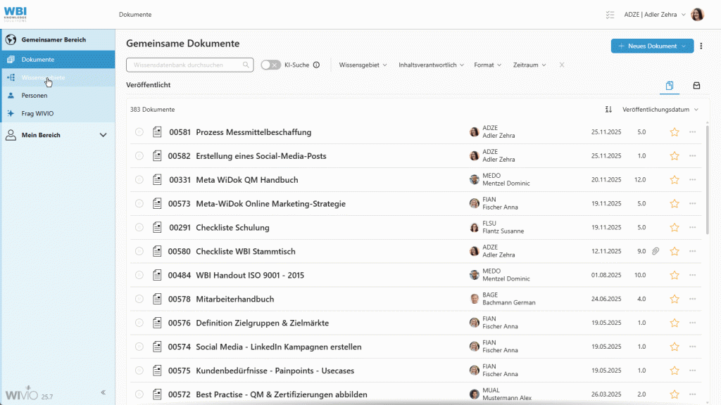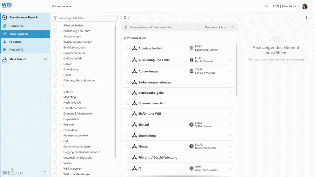 • Benutzer:innen sehen jene Wissensgebiete, für die sie die notwendigen Sichtrechte besitzen